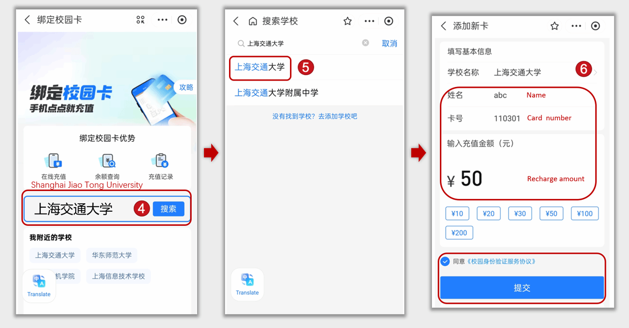 6. Please enter your name, campus card number, and recharge amount in the corresponding fields, then check the box to agree. Finally, click “Submit.”