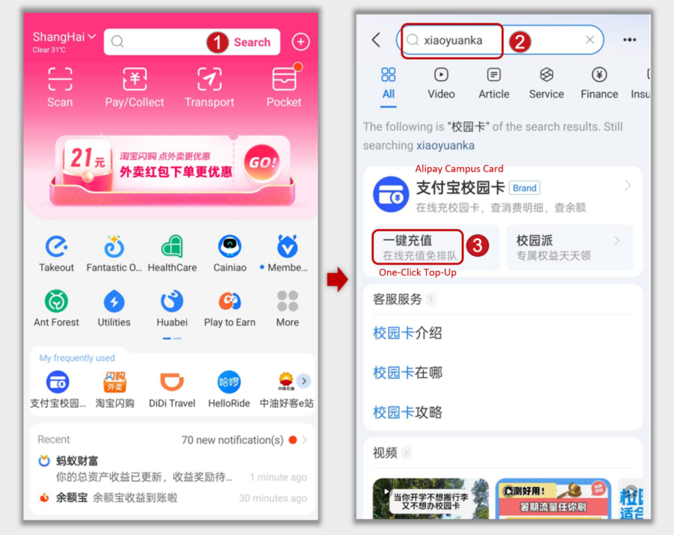 3. In the search results, click “One-Click Top-Up” under the “Alipay Campus Card” section.